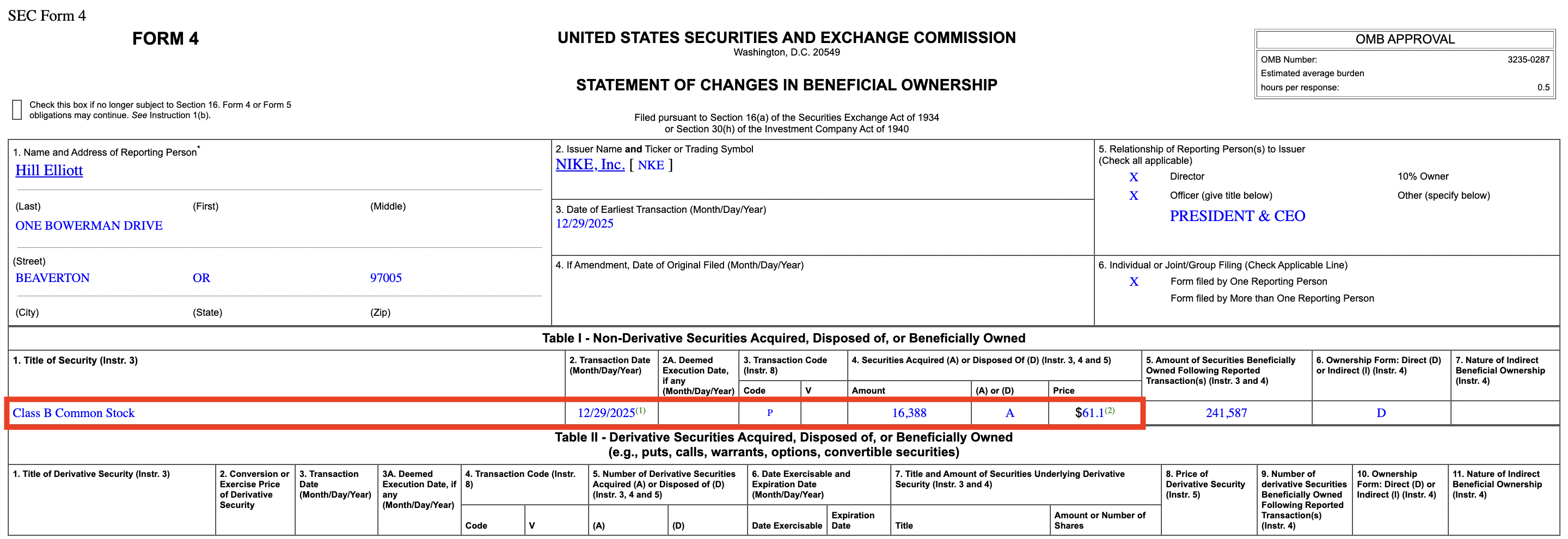 3. Nike (NKE) - Elliott Hill, CEO, bought over $1,000,000 worth of NKE at $61.10/share on Dec. 29, 2025, but it was most recently reported to the public on Dec. 30, 2025. (Source)