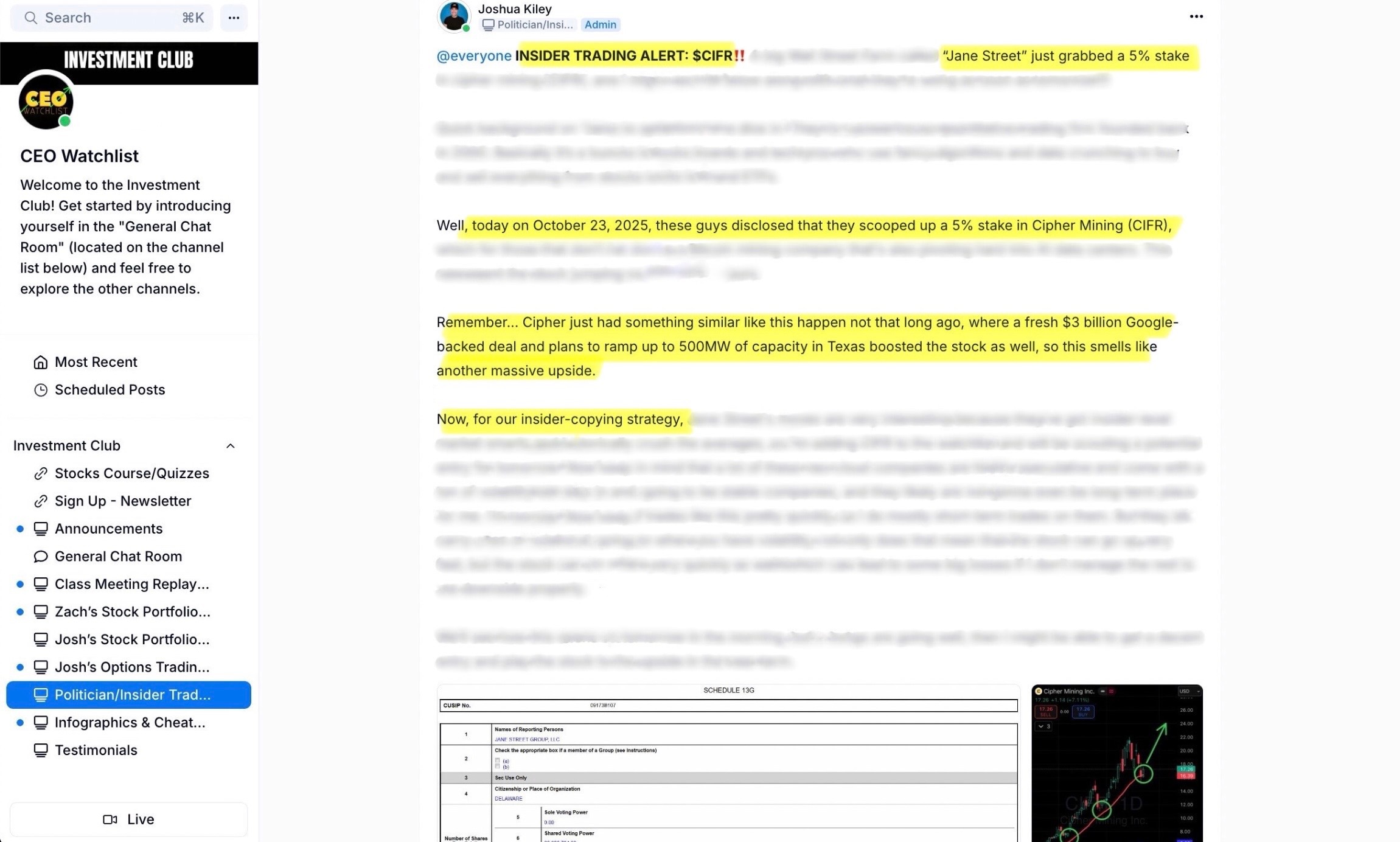 Opportunities like these happen everyday in the stock market, as long as you know where to look, and what to look for. We shouted Cipher out to our Investment Club before the massive run-up, as you can see below: