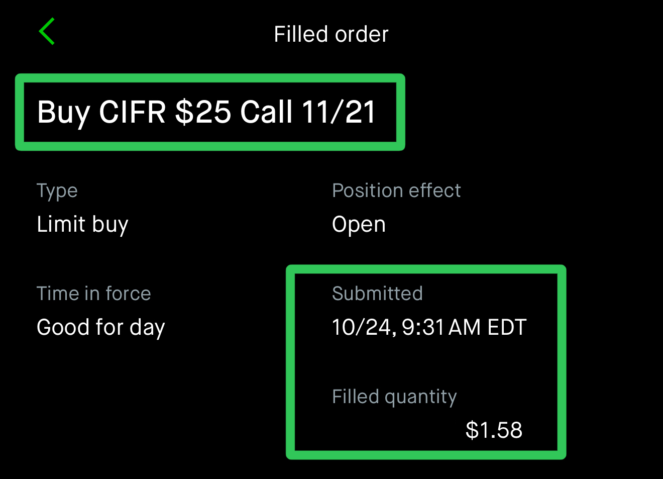 During our private live trading session with our Investment Club members, we bought call option contracts on Cipher as soon as the market opened, as you can see below: