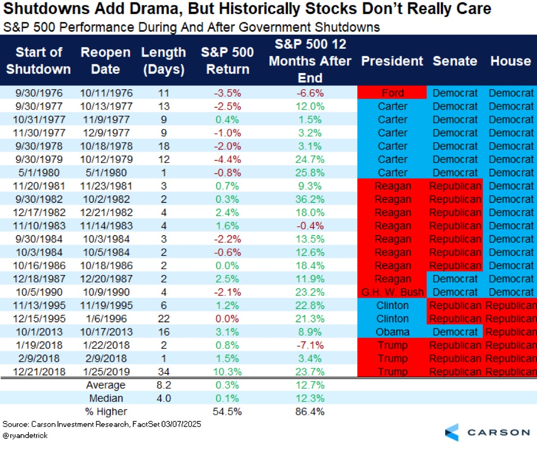 This past week, the government did something it hasn't done since 2018...it shut down! Yes, I know it sounds crazy, but even our government can close its doors. With Washington grinding to a halt, federal agencies closing, workers not working, and media headlines screaming "CRISIS!" you would think this is really bad for the stock market, but shockingly it isn't. Now although this sounds really bad and scary, data suggests it's not as bad as it may seem. Government shutdowns rarely inflict lasting damage on markets. Instead, they create dislocations, spark short-term volatility, and then fade into the background as corporate earnings, monetary policy, and global capital flows reassert themselves. This weekâs shutdown is no different. It will stretch into the weekend unresolved, but for investors the real question is not âhow bad can this getâ but âwhat opportunities does this open.â