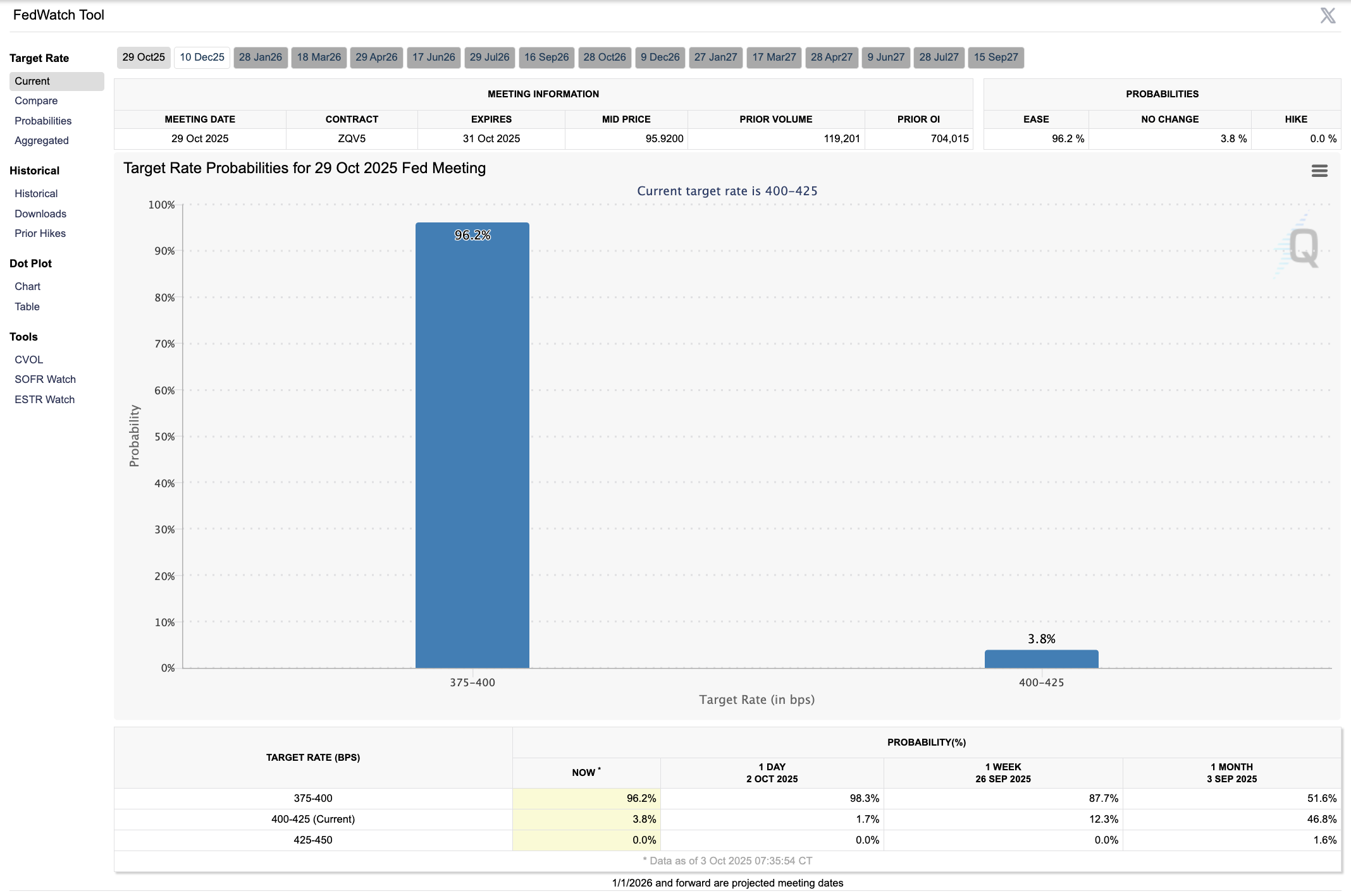 Pictured above is the "Fed Watch Tool". This shows us the odds for how much the Fed will cut rates during the next meeting. As you can see currently, since the government shutdown, the odds for a rate cut have jumped to over 96% in favor of a rate cut.