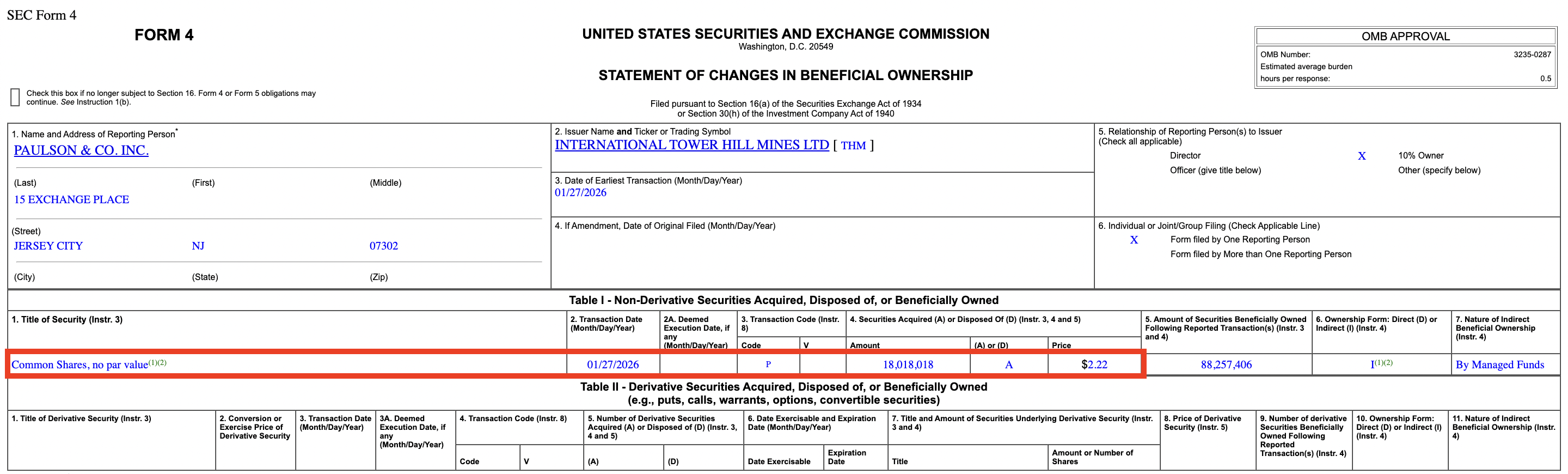 1. International Tower Hill Mines (THM) - Billionaire John Paulson, through his investment firm Paulson & Co., bought roughly $65,000,000 worth of THM at an average price of $2.22/share between Jan. 27-28, 2026, but it was most recently reported to the public on Jan. 30, 2026. This is the second time in the past month that this billionaire has bought up millions of dollars of shares. (Source)