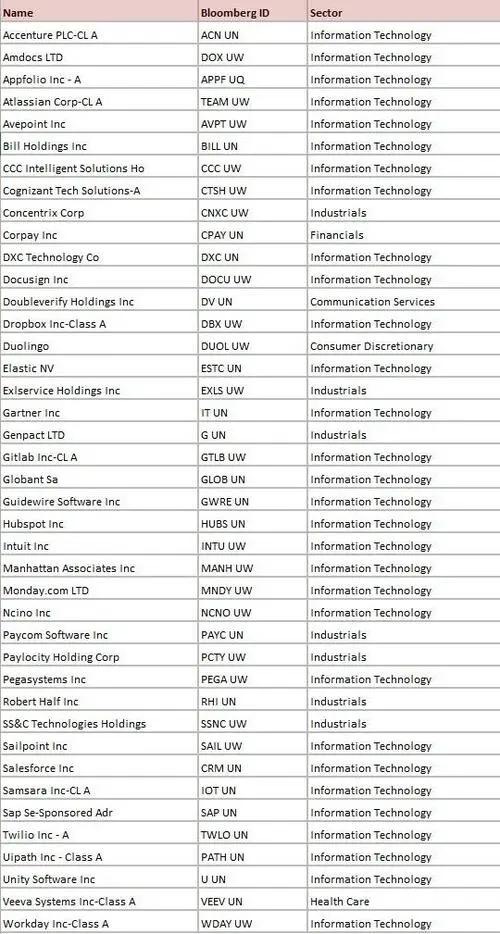 For the last decade, companies were rewarded handsomely for digitizing paper trails, managing human resources, or providing basic enterprise organization. But Goldman Sachs rightly points out that this basket of software stocks, companies heavily reliant on static software-based workflows and per-seat licensing, should be actively bet against. If an autonomous AI agent can seamlessly write code, manage customer relationships, and execute complex logic without a human operator, the underlying software tool loses its pricing power. The bear case for these traditional SaaS (Software-as-a-Service) companies is existential: AI simply does the work instead of providing a dashboard for a human to do it. While incumbents argue that they have entrenched customer distribution and can simply bolt-on AI features to survive, the harsh reality of technology history shows that paradigm shifts almost always favor native disruptors over bloated legacy platforms trying to pivot. As such, here is the full list of the names that Goldman Sachs believes will be disrupted: