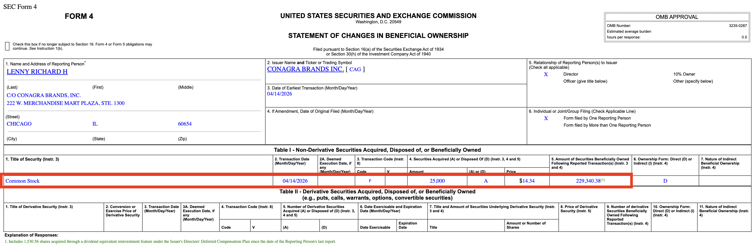 2. Conagra Brands (CAG) - Richard Lenny (Director) bought roughly $400,000 of CAG at an average price of $14.34/share on April 14, 2026, but it wasn't reported to the public until April 15, 2026. (Source)