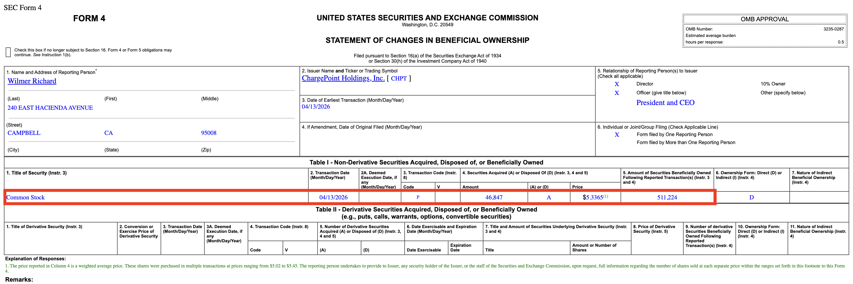 3. ChargePoint (CHPT) - Richard Wilmer (CEO) bought roughly $250,000 of CHPT at an average price of $5.33/share on April 13, 2026, and it was reported to the public later that same day. (Source)