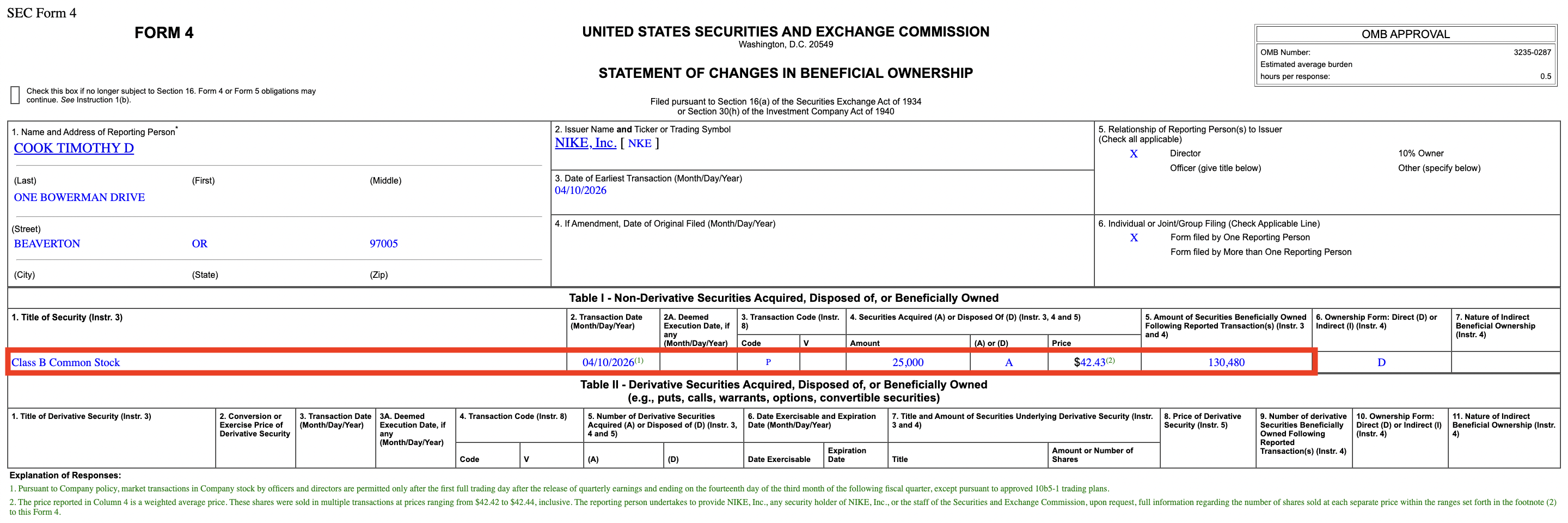 1. Nike (NKE) - Tim Cook (CEO of Apple) bought roughly $1,000,000 worth of NKE at an average price of $42.43/share on April 10, 2026, but it wasn't reported to the public until April 14, 2026. (Source)