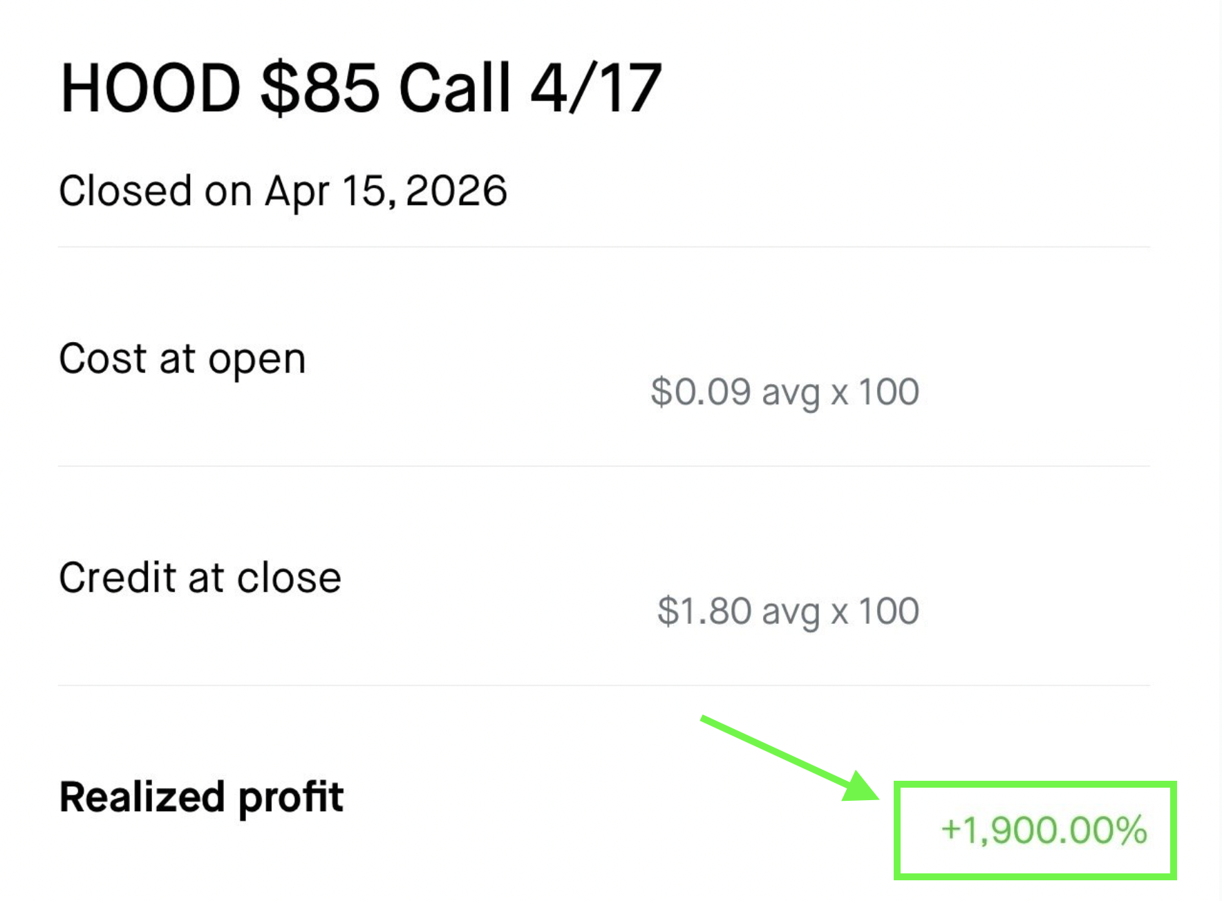 But it wasn't just us who made a killing, even our students took out bullish positions on Robinhood and by utilizing call options (instead of buying shares) were able to turn this single trade into a staggering 1,900% gain, as you can see in the screenshot below: