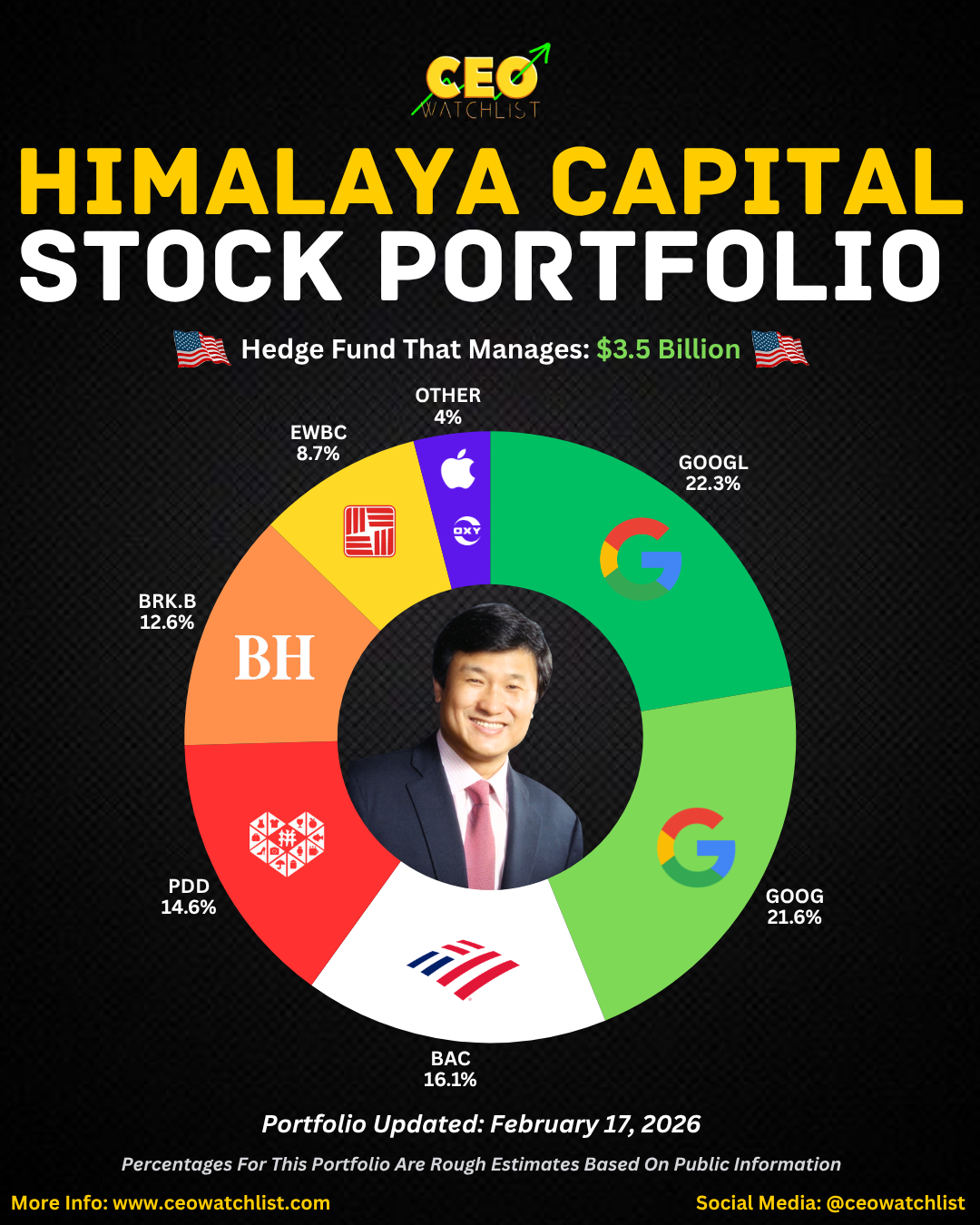 Li Lu’s newest 13F filing reveals a "Super Investor" who is not afraid of massive concentration. Managing roughly $3.5 billion in U.S. equities, his portfolio consists of only 9 holdings. While many investors are currently worried about the volatility in "Big Tech" and the shifting landscape in China, Li Lu has remained steadfast. He hasn't followed the crowd into the newest AI hype cycles; instead, he has doubled down on the "toll booths" of the internet and the backbone of the banking system.