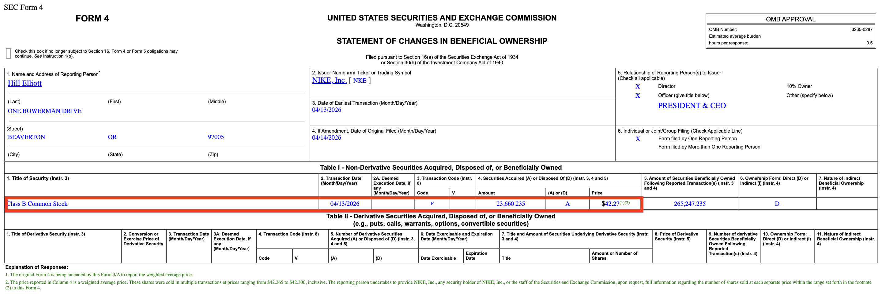 3. Nike (NKE) - Elliott Hill (CEO) bought roughly $2,000,000 of NKE at an average price of $42.27/share on April 13, 2026, but it wasn't reported to the public until April 22, 2026. (Source)