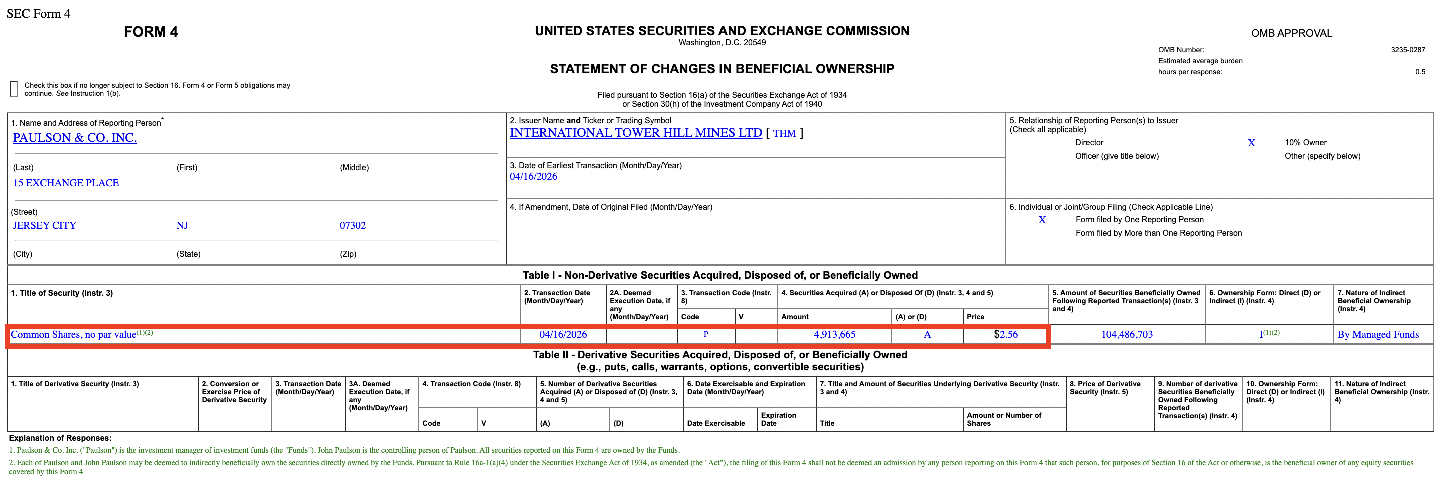 2. International Tower Hill Mines (THM) - Billionaire John Paulson (Director) bought roughly $25,000,000 of THM at an average price of $2.56/share on April 16, 2026, but it wasn't reported to the public until April 20, 2026. (Source)