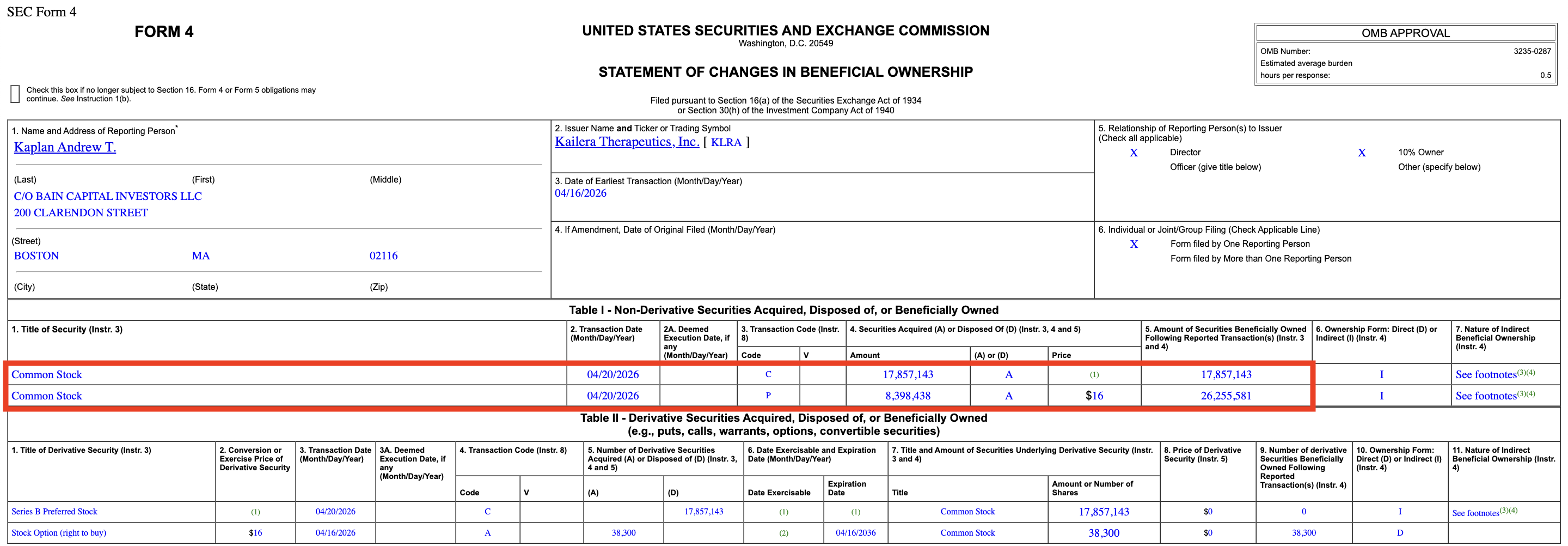 1. Kailera Therapeutics (KLRA) - Andrew Kaplan (Director) bought roughly $134,000,000 worth of KLRA at an average price of $16/share on April 20, 2026, but it wasn't reported to the public until April 22, 2026. (Source)