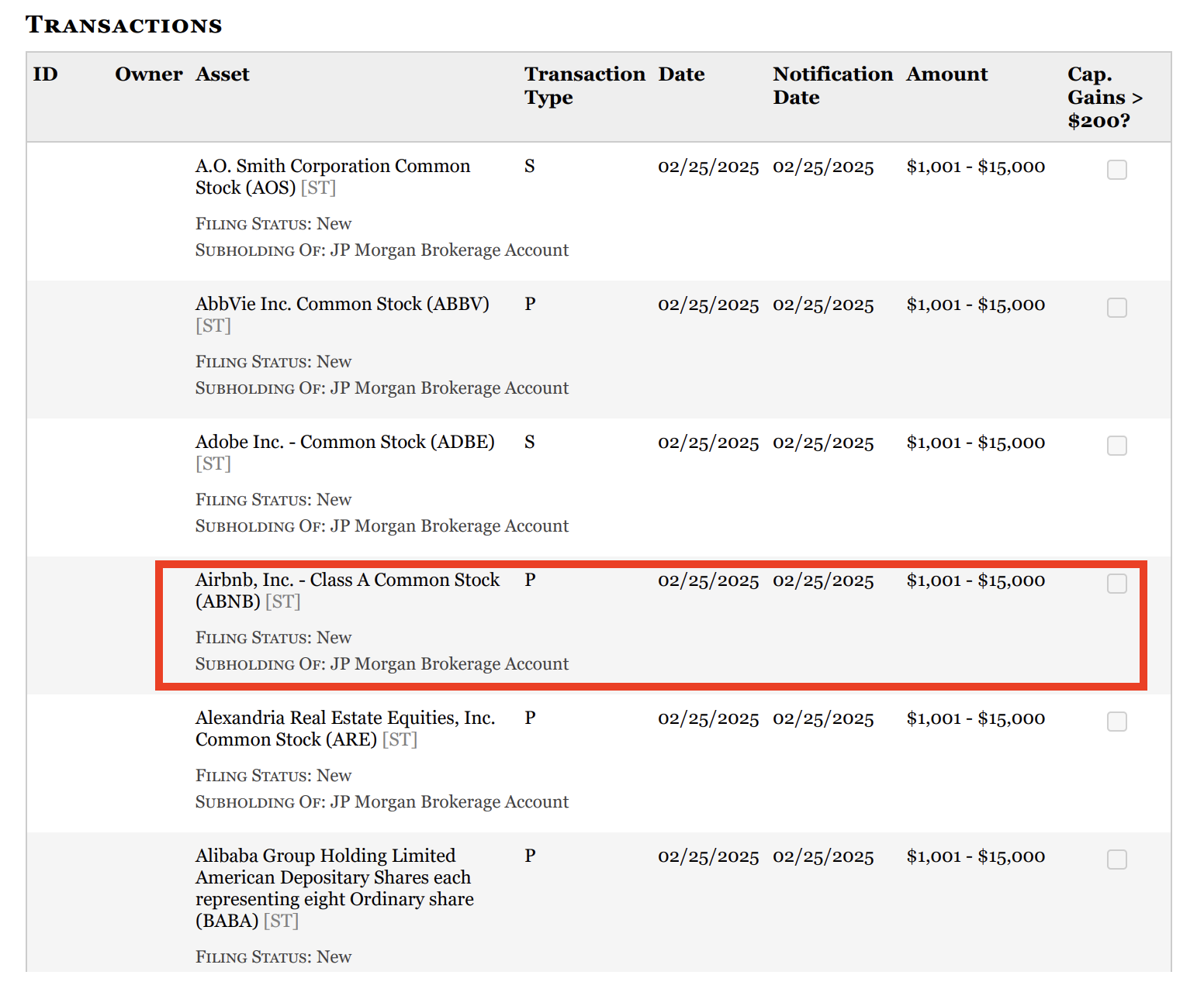 3. Airbnb (ABNB) - Rob Bresnahan, a House Rep. In Pennsylvania, bought between ~$1,001-$15,000 worth of ABNB stock on February 25, 2025, but it was reported to the public on March 28, 2025. (Source)