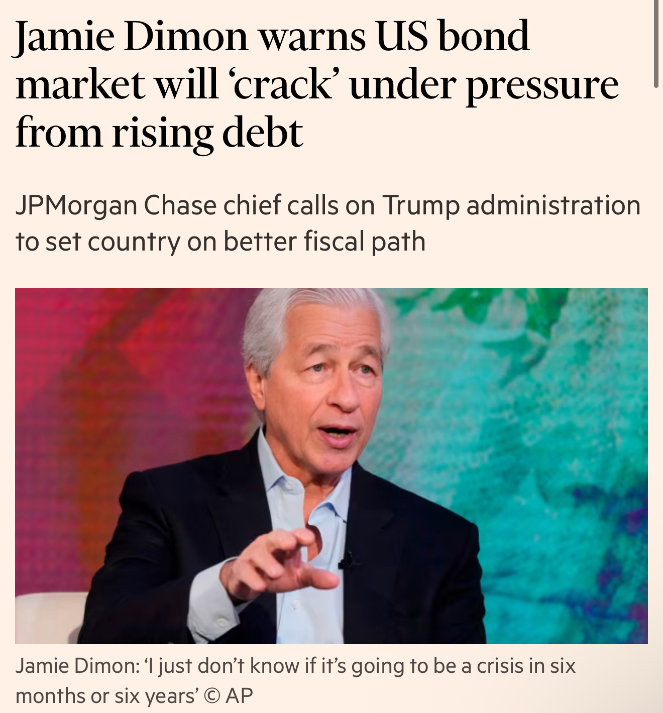 When Jamie Dimon, the most powerful banker on Wall Street, says, “You’re going to have a problem, and you’re going to panic,” the world should listen. His latest warning isn’t just about rates going higher, it’s about a systemic crack in the bond market caused by America's unchecked debt binge. The media calls it a “bond market crisis”, but investors need to reframe this moment: it’s not a crisis, it’s a reallocation. A once-in-a-generation capital rotation away from fragile, rate-sensitive assets and toward companies built for chaos.