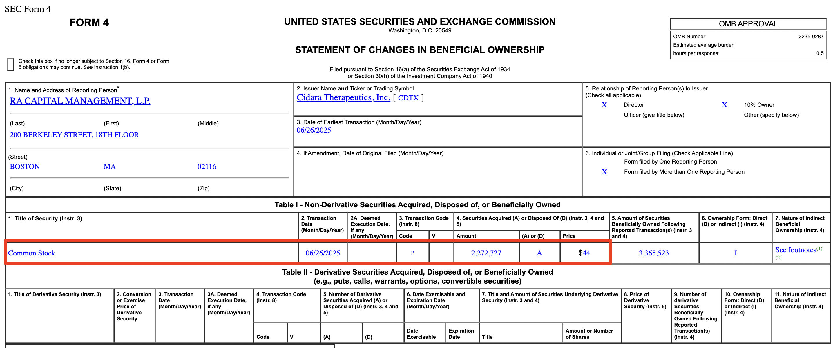 1. Cidara Therapeutics (CDTX) - RA Capital Management, a hedge fund that specializes in biotech investments, bought ~$100 million of CDTX stock on June 26, 2025, but it was reported to the public on June 30, 2025. (Source)