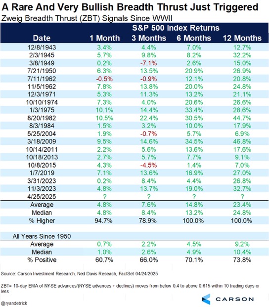 The S&P 500 (VOO) extended its rally and triggered the rare Zweig Breadth Thrust (ZBT) Indicator, a historically bullish signal suggesting stocks often rise over the next 6–12 months with 100% accuracy, which can be seen in the data table below from Carson Research. Analysts like Mark Newton and Dean Christians view it as a positive intermediate-term sign, but caution that the market still faces risks, especially from unresolved tariff issues and weak economic data. Some experts, including Tom McClellan, warn that this rally could be just a bear market bounce, with the broader downtrend still intact.