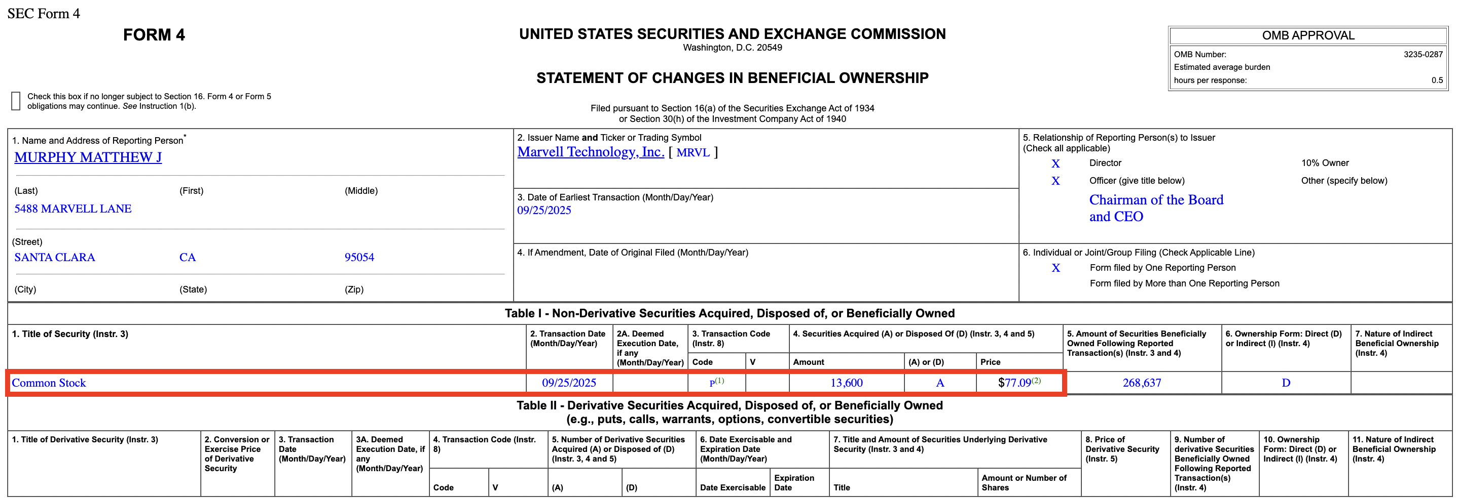 1. Marvell Technology, Inc. (MRVL) - Matthew Murphy, CEO and Chairman of the board, bought ~$1,000,000 of MRVL stock on Sep 25, 2025, and it was reported later the same day. Also note that multiple other insiders are also purchasing MRVL stock at a similar price. (Source)